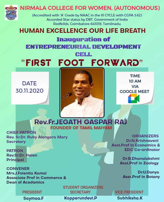 The Entrepreneurship Development Cell (EDC) was inaugurated in the month of October 2020 with the aim of developing and strengthening entrepreneurial skills of young women students to choose self-employment as a career and to foster their innovative ideas. EDC of Nirmala College bestows the students with the opportunity to take that risk and march towards glory.