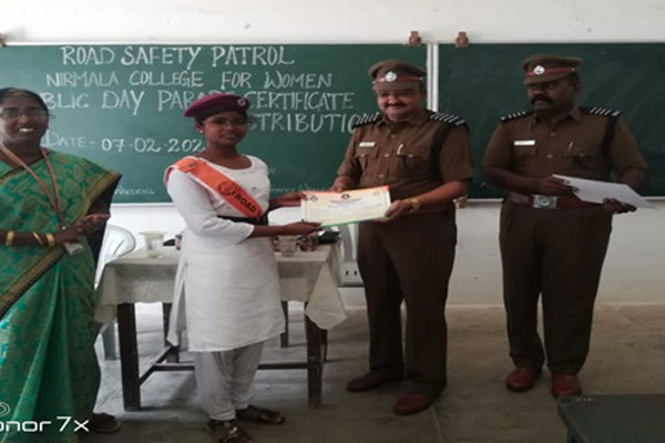 The Road Safety Patrol was initiated in Nirmala College for Women from 2009 to till date. The Road Safety Patrol is involved in the educational aspect of Road Safety. The RSP Scheme commenced way back in 1951, and was flagged off from the New Bharda High College at Fort Mumbai. Traffic wardens play an important and major role in the R.S.P. they are the liaison between the colleges and the police. They will supervise the working of the units in the college or colleges in their change and check the work done by the cadets.